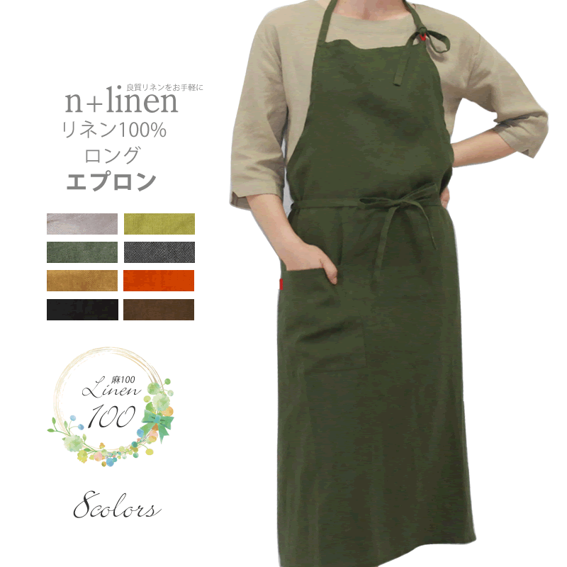 (カーキ)リネンエプロン リネン100% 大人 オシャレ 麻リネンワンピース リネン生地 リネンエプロン ロング丈で男女兼用 リネンシャツ リネンブラウス 母の日 ギフト
